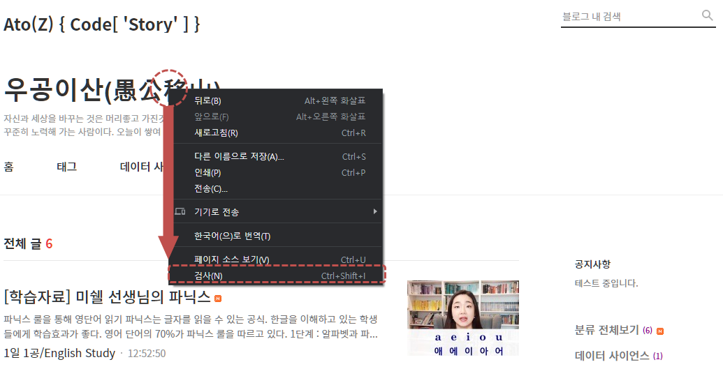 1. 크롬을 이용해 블로그에 접속 후 'F12'키를 눌러보면 현재 접속한 블로그의 구조를 파악할 수 있다.