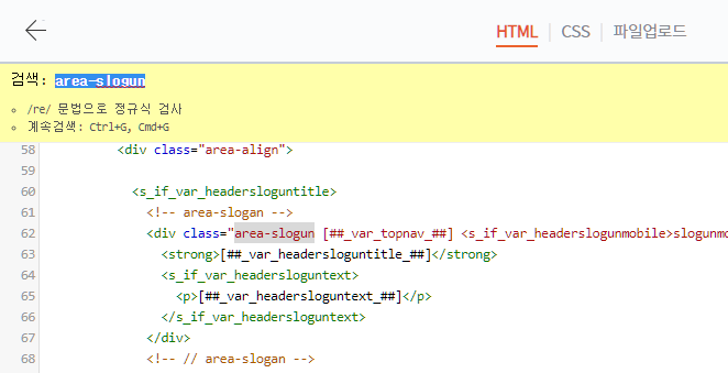 - 검색 방법 : HTML 편집 > HTML에서 Source Code 선택 후 Ctrl + F로 검색 후 수정.