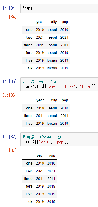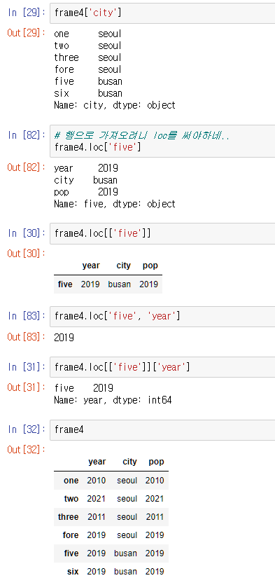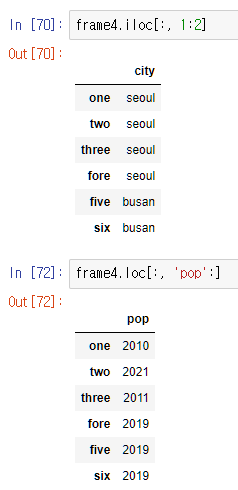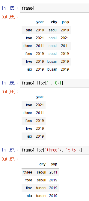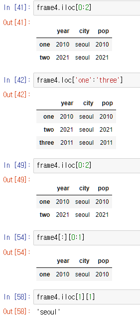 - frame4.iloc[1:3] 의 경우 실제 1~2 행을 슬라이싱함.