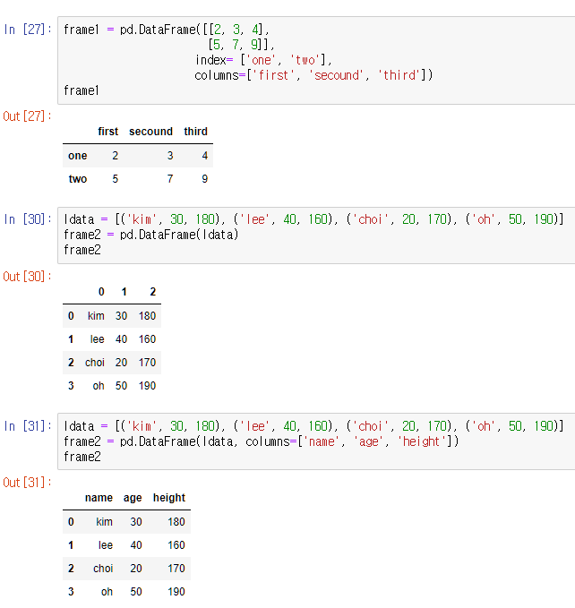 데이터를 주고 "index"와 "columns"를 선언하는 형태 ( 데이터와 정보간의 개수 또는 짝이 맞는지 주의 )